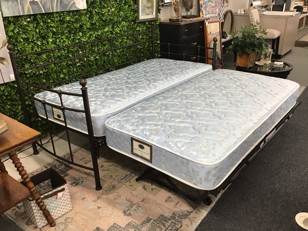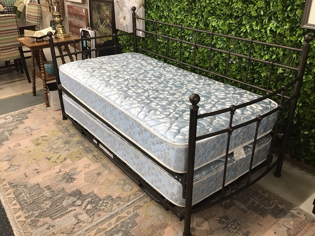 Metal frame with trundle and two twin mattresses