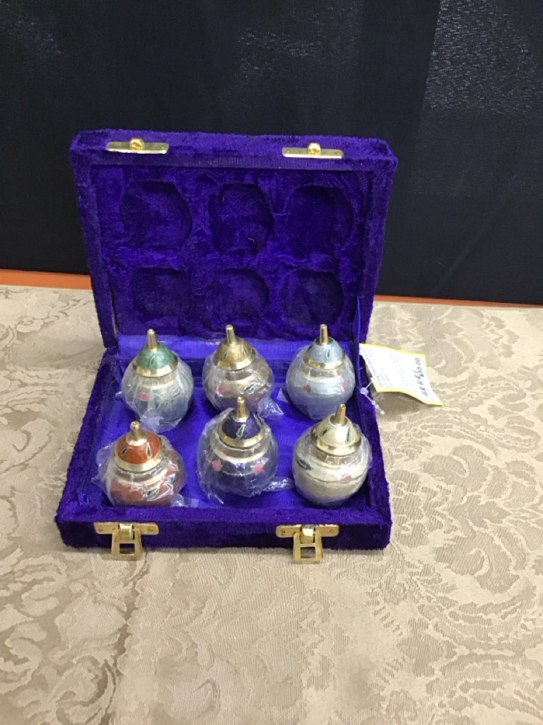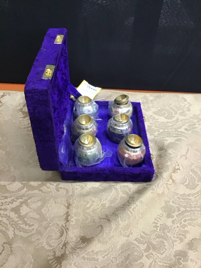 Blue Velvet Box Set of Five Brass Vases Decor