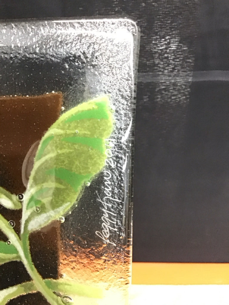 Peggy Karr - Fused glass plate, white peony, signed