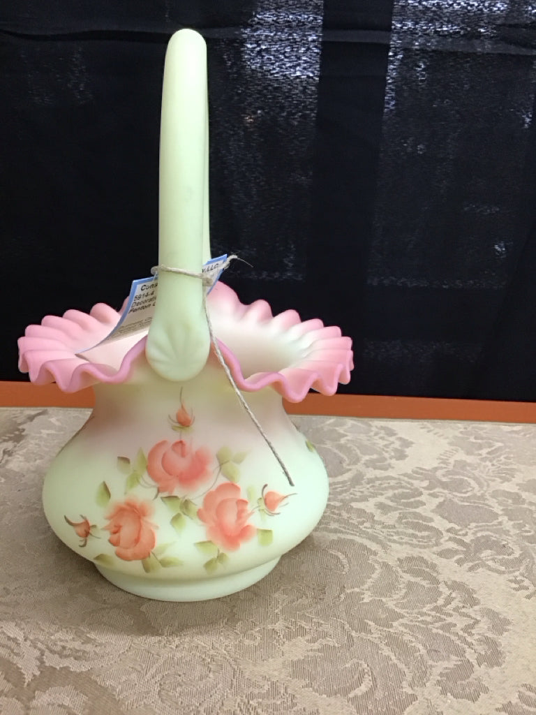 Burmese Glass Hand Painted Roses Basket 8" Yellow/Rose Colored Signed