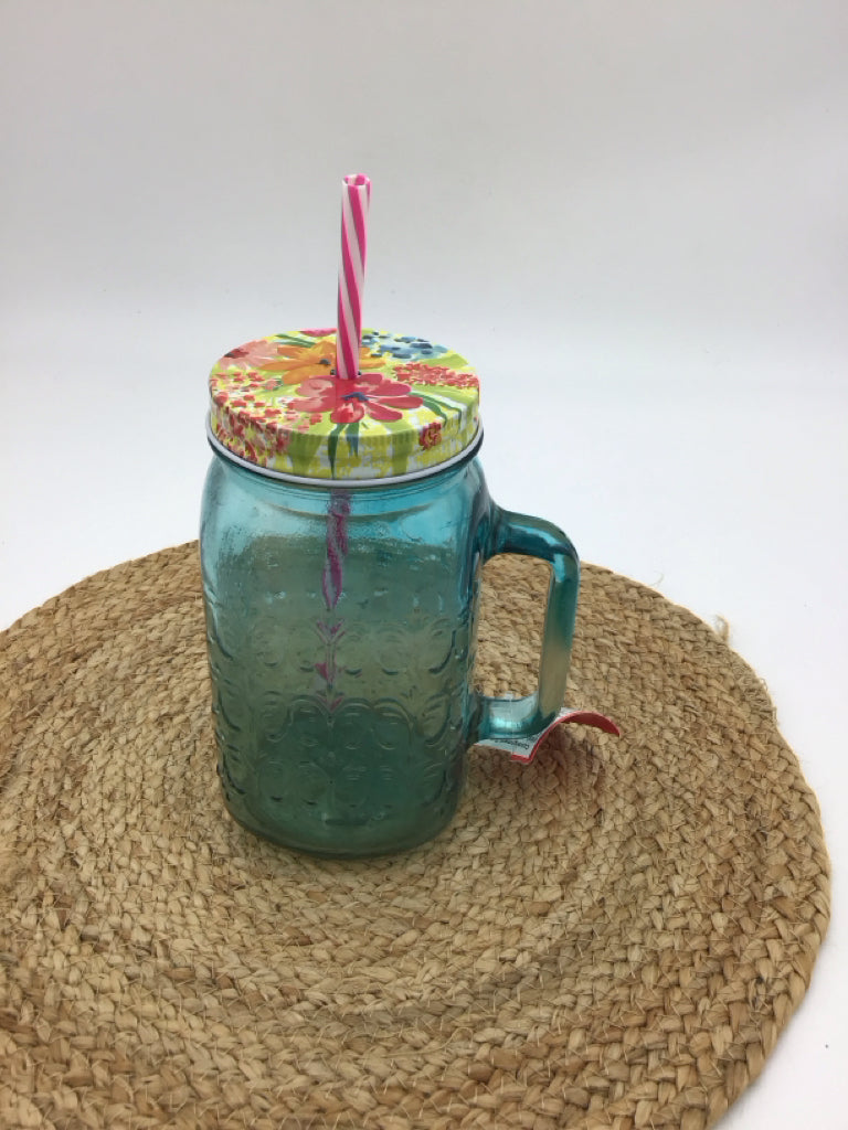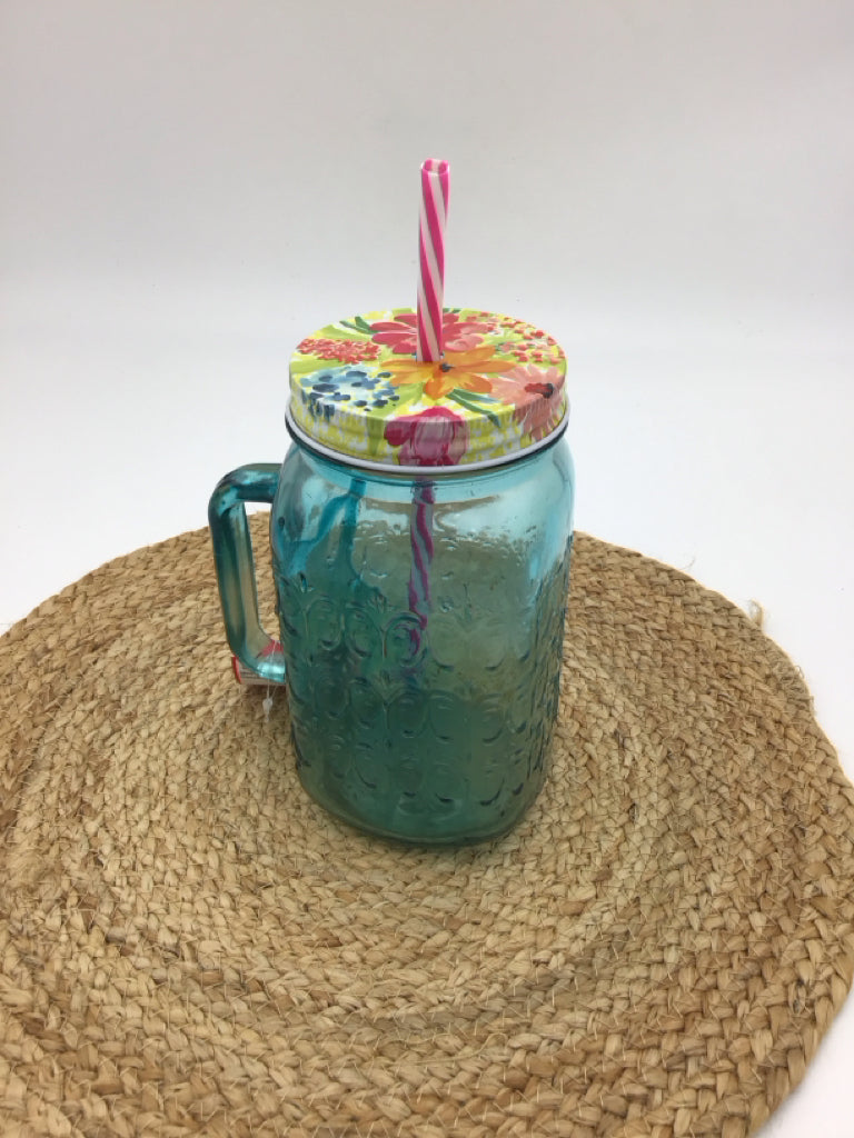 Pioneer Woman "Cassie" Teal Mason Jar Drinking Glass W/Lid & Straw 32 OZ