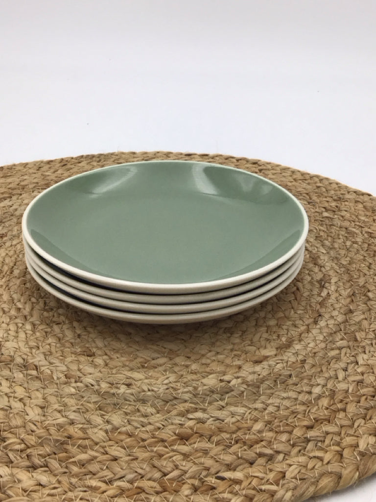 Set/4 6 1/2" Round Appetizer Plates Sage Green Persian Key Harkerware USA 1966- MCM Vintage