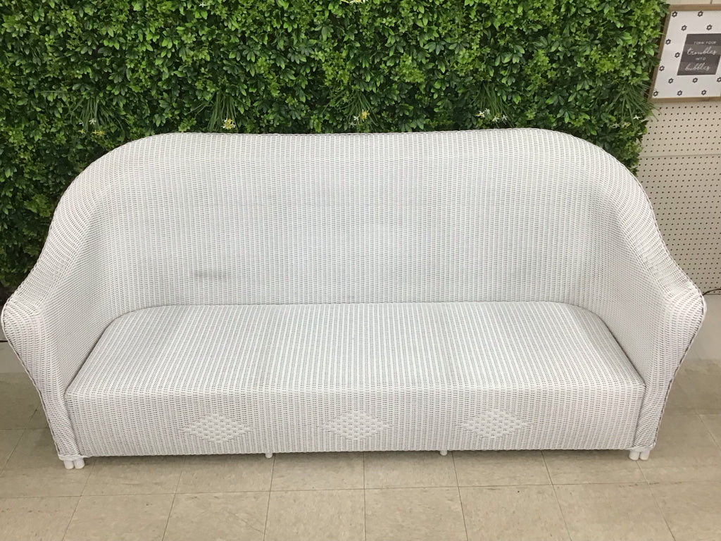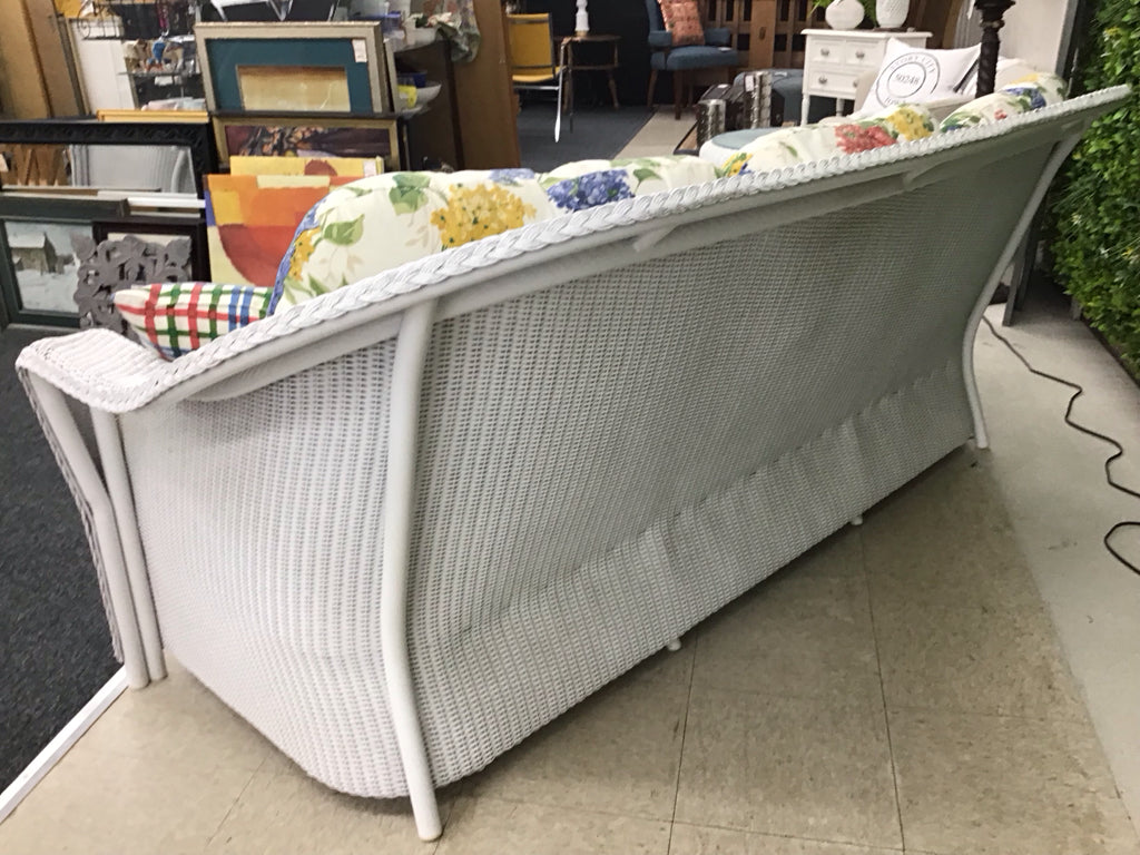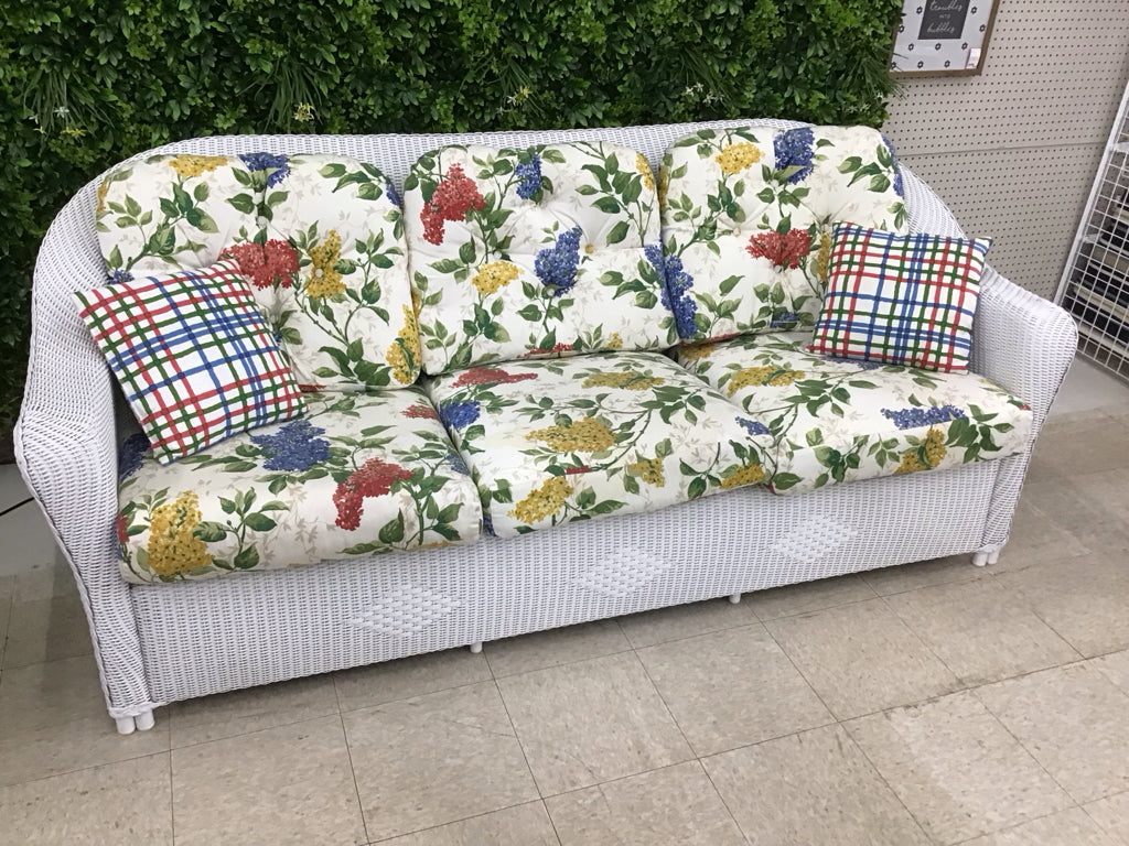 White wicker sofa, 3 cushion with 3 throw pillows