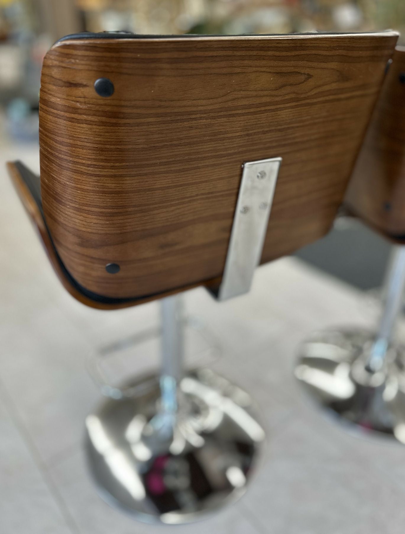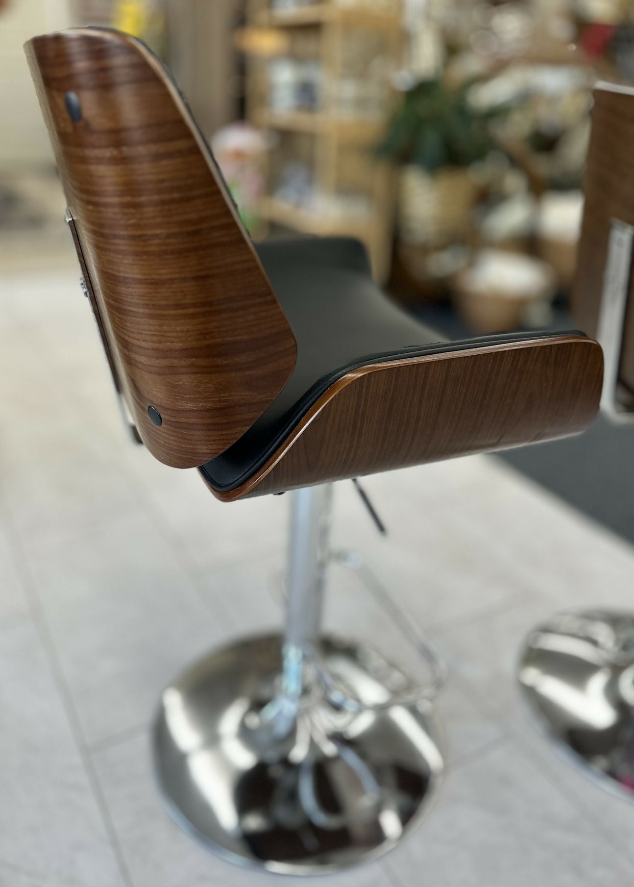Pair of Adjustable swivel bar stool with black faux leather and walnut bentwood shell