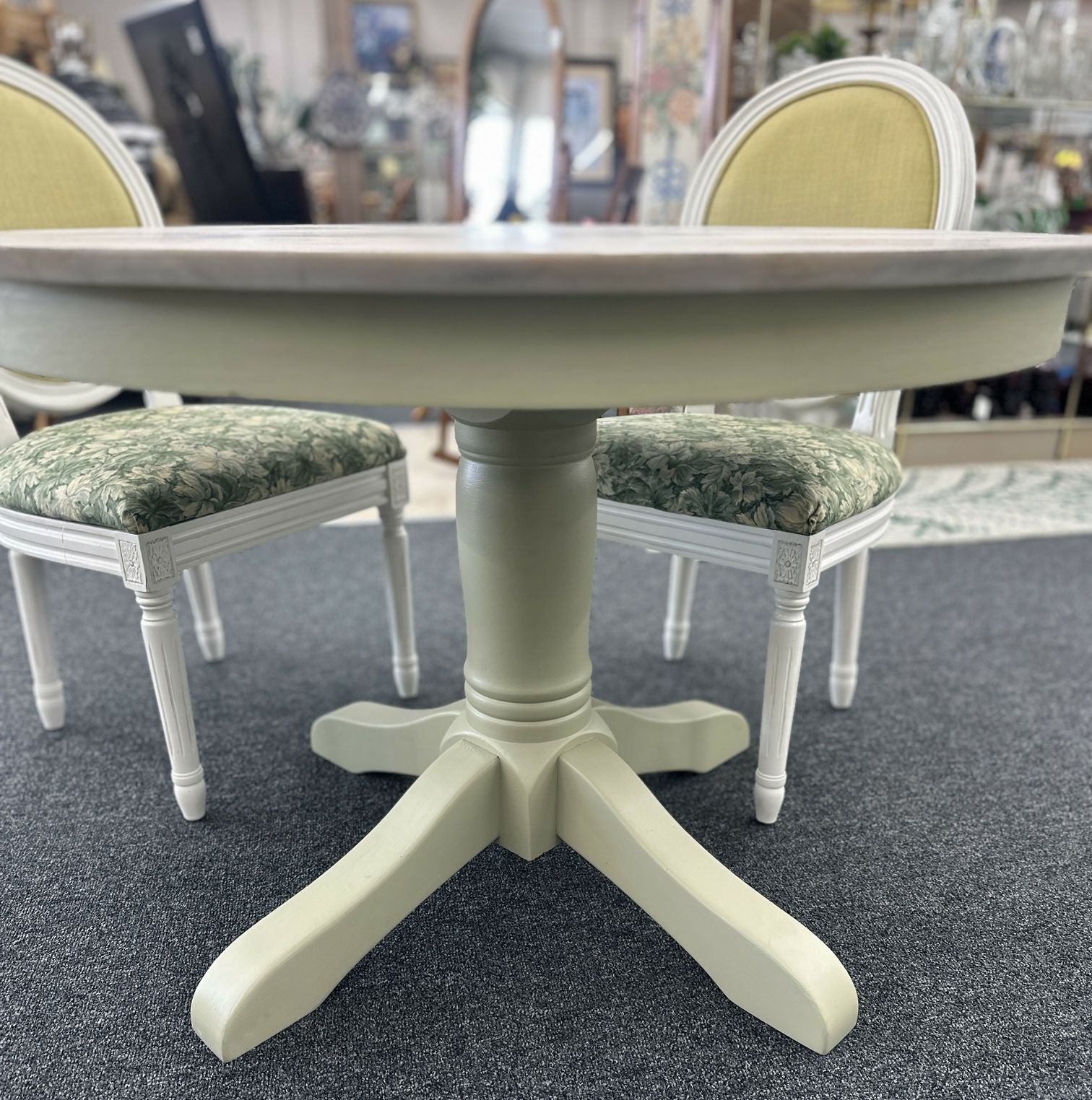 42" Round White washed pedestal table with four chairs (botanical fabric)