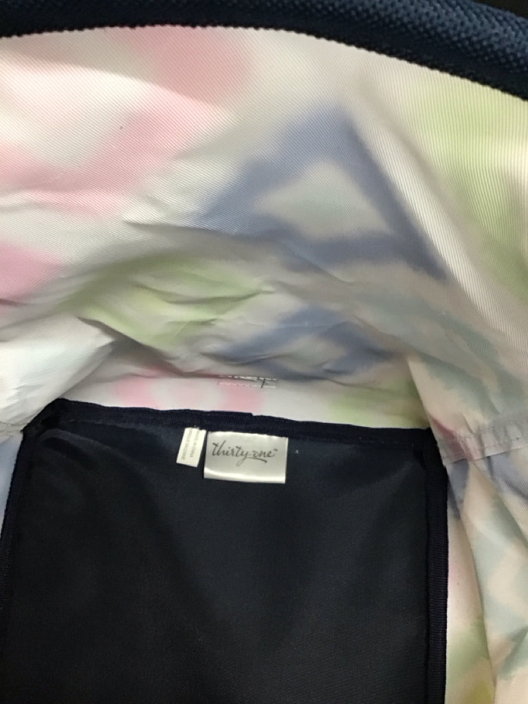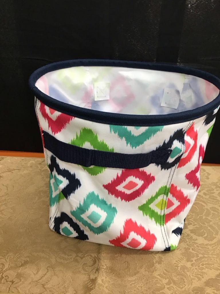Basket with blue trim, colorful diamond print, teal bird on front, w/handles