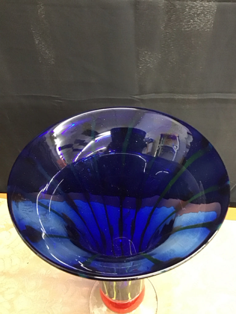 12" MCM Hand blown blue, red, yellow swirl art glass vase